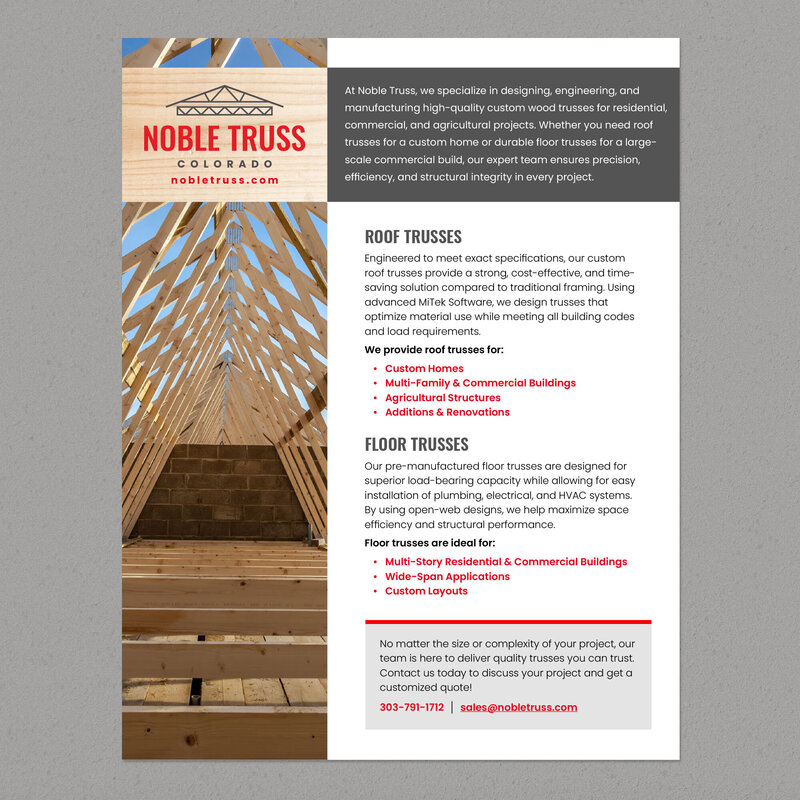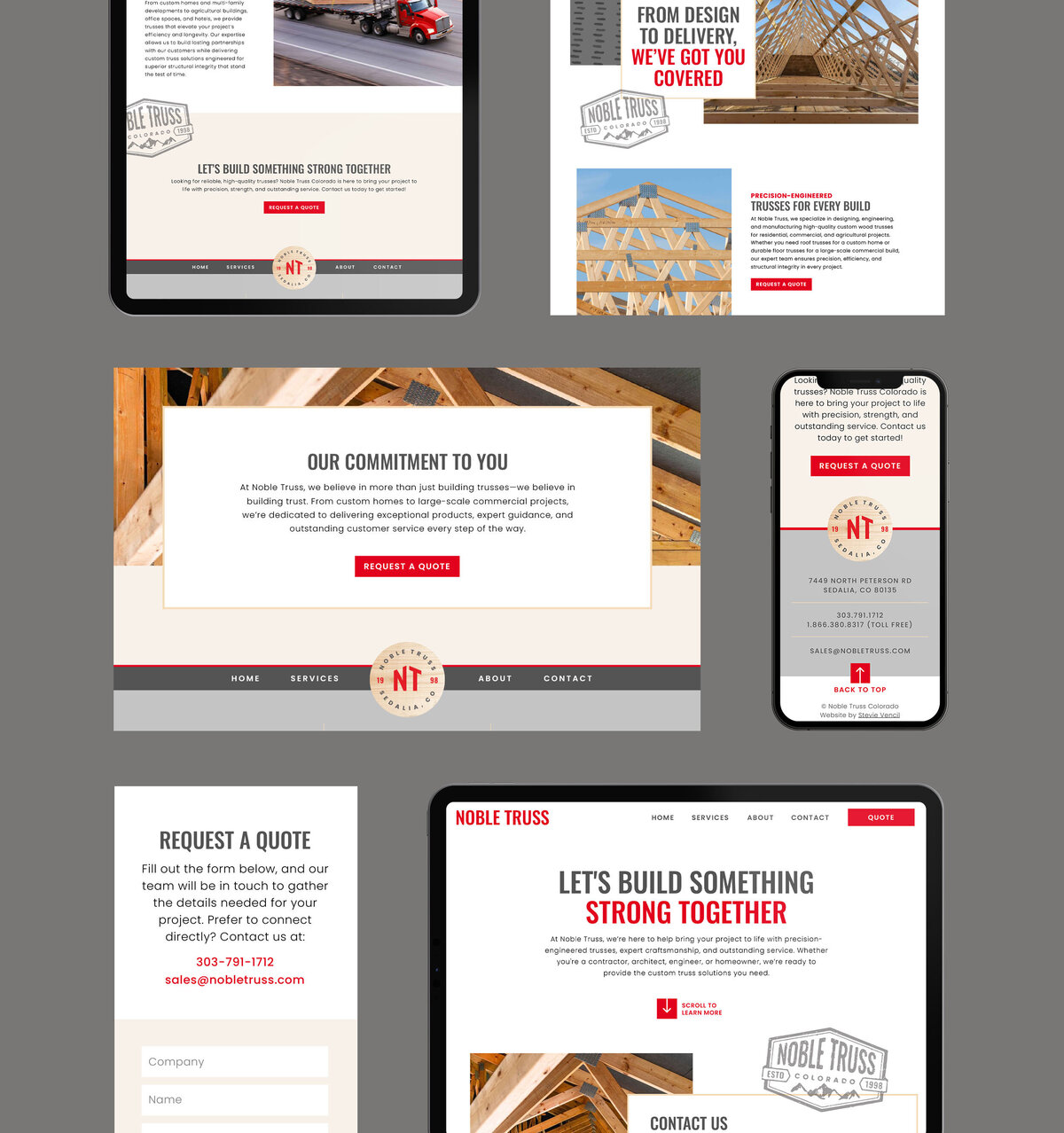 Deliverables included a clean, easy-to-navigate website that showcases their capabilities and encourages quote requests, as well as branded business essentials: a professional letterhead, a one-page marketing PDF, and a fillable quote PDF designed to streamline client communication. Each piece was created with consistency and practicality in mind, helping Noble Truss present a polished and trustworthy image at every touchpoint.